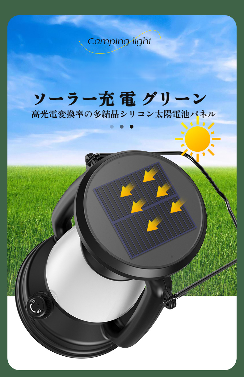 ソーラー充電パネル付きキャンプランプ